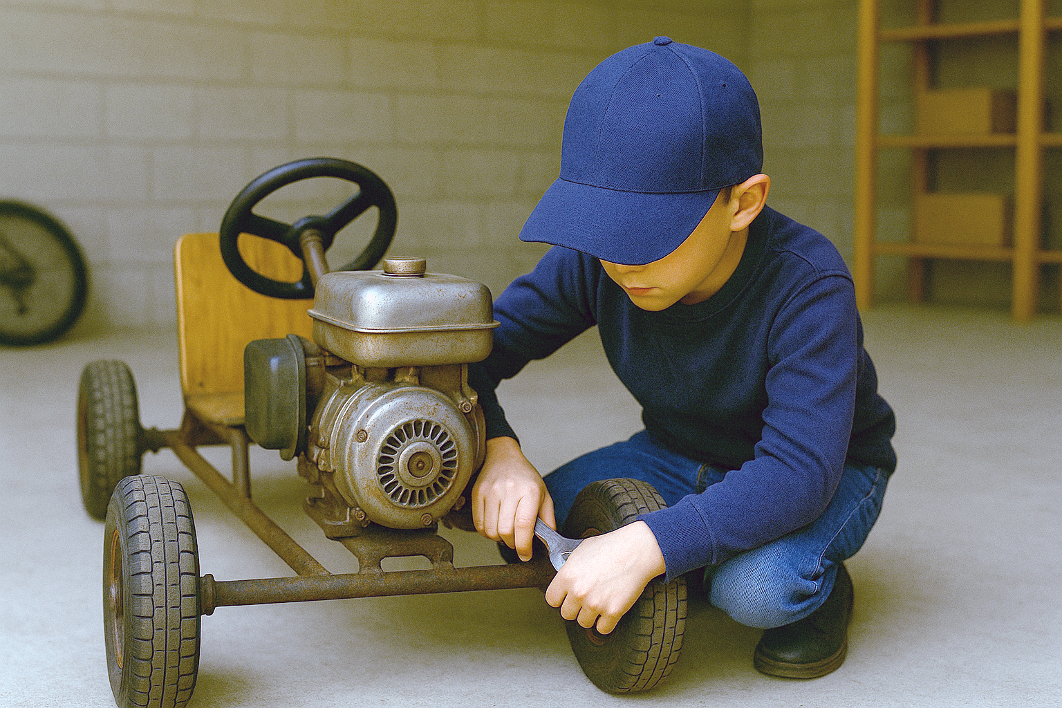 To everyone’s surprise and many incredulous smiles, he got right to work. Any money he could make was put to the task. Rusty metal, second hand tools and reclaimed parts were acquired and manufactured turning his parents’ garage into a makeshift workshop. By the age of 12 Juan had designed&built a go-kart from scratch.